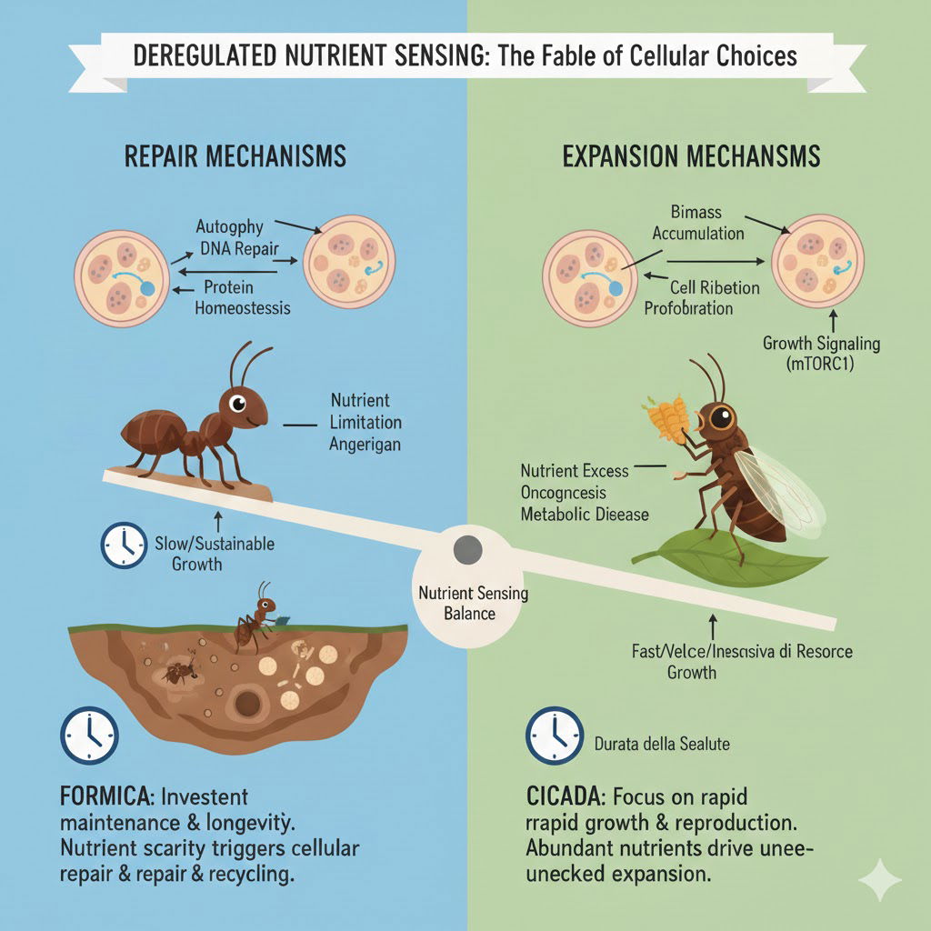 Nella medicina della longevità, il deregulated nutrient sensing rappresenta uno dei meccanismi centrali dell’invecchiamento. Comprendere questo processo significa afferrare una parte sostanziale, probabilmente una delle più rilevanti, della biologia che regola la durata e la qualità della nostra vita. Nel mio ultimo libro, Medicina della longevità, ho scelto di spiegare questo concetto attraverso una metafora semplice: la favola di Esopo della cicala e della formica.